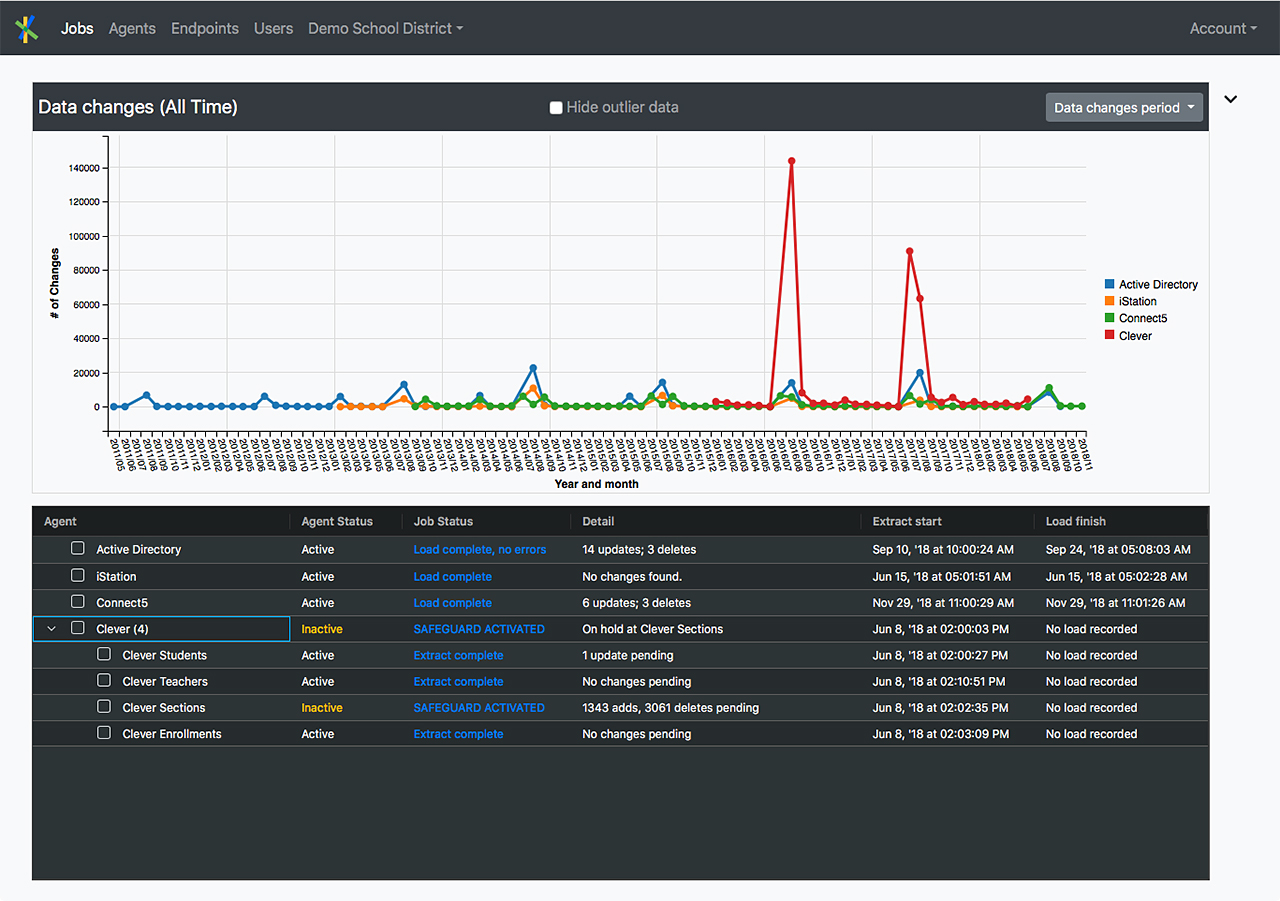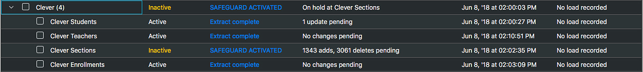 Here the “Parent” agent is “Clever” and it’s children are “Clever Students”, “Clever Teachers” and so forth. In the “Job Status” column this agent indicates “SAFEGUARD ACTIVATED” for the Parent and one child, “Clever Sections” … and you can see why!