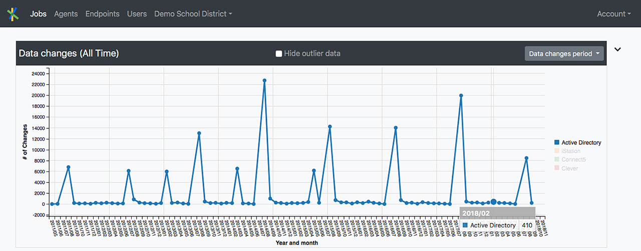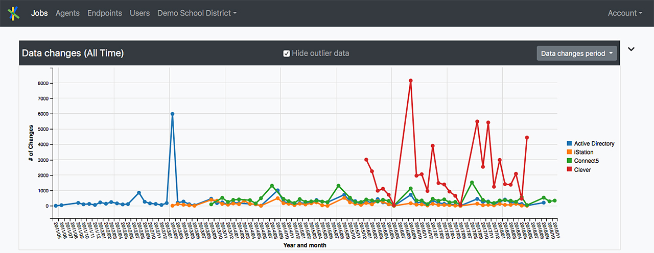 In the example above, the “Data changes period” menu is set to “All Time” selected but we see the change data looks really flat for most of the jobs because we have some huge spikes in the Clever change data. Often that sort of change can be traced to year end transitions or even manual manipulations of the job that artificially caused a spike in changes for a job or two. Clicking the “Hide outlier data” checkbox at the top of the chart will rationalize the data bit.