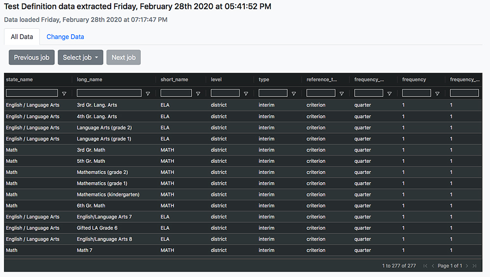 2. Each row in the table represents an agent with it’s latest job status. Clicking on the blue text in the “Job Status” column will first display all of the data extracted and transformed for the job like the following example: