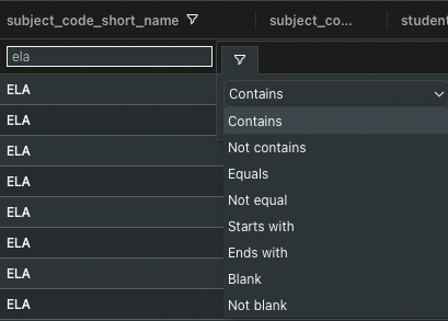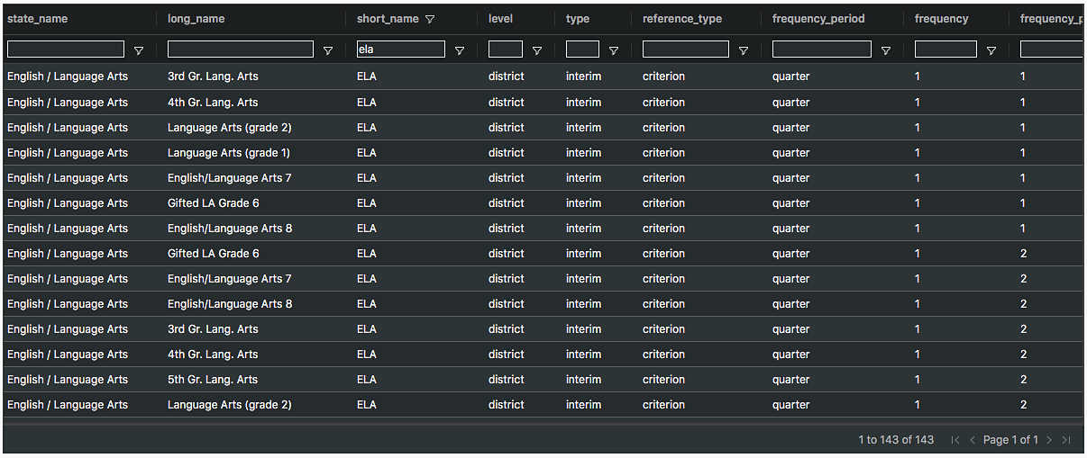 3. Let’s say (using the above screenshot) you want to see data where the short_name of the data includes the text “ela”. To do this, you’ll add a filter. To filter the table on short_name = “ela”, you can click in the text entry field under the short_name column header and type “ela” and the list will instantly filter like: