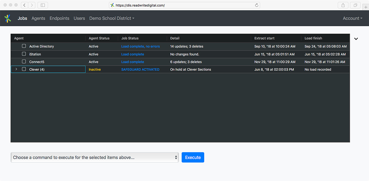 1. Login to your Integrator portal at https://dis.readwritedigital.com/. You will immediately see your “Jobs” dashboard listing your agents and their most recent jobs. You may have one agent or one-hundred but you’ll generally see something like the following list of 4 agents and their associated job data:
